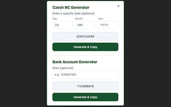 L'outil "Account & RC Generator" est une extension gratuite pour Chrome conçue pour générer des numéros de compte bancaire tchèques et des numéros d'enregistrement (RC) valides. Destinée principalement aux professionnels du QA, cette extension facilite le processus de test en fournissant des données réalistes et conformes aux normes tchèques. Les utilisateurs peuvent facilement générer des numéros en quelques clics, ce qui améliore l'efficacité des tests de logiciels et d'applications nécessitant des informations financières.
